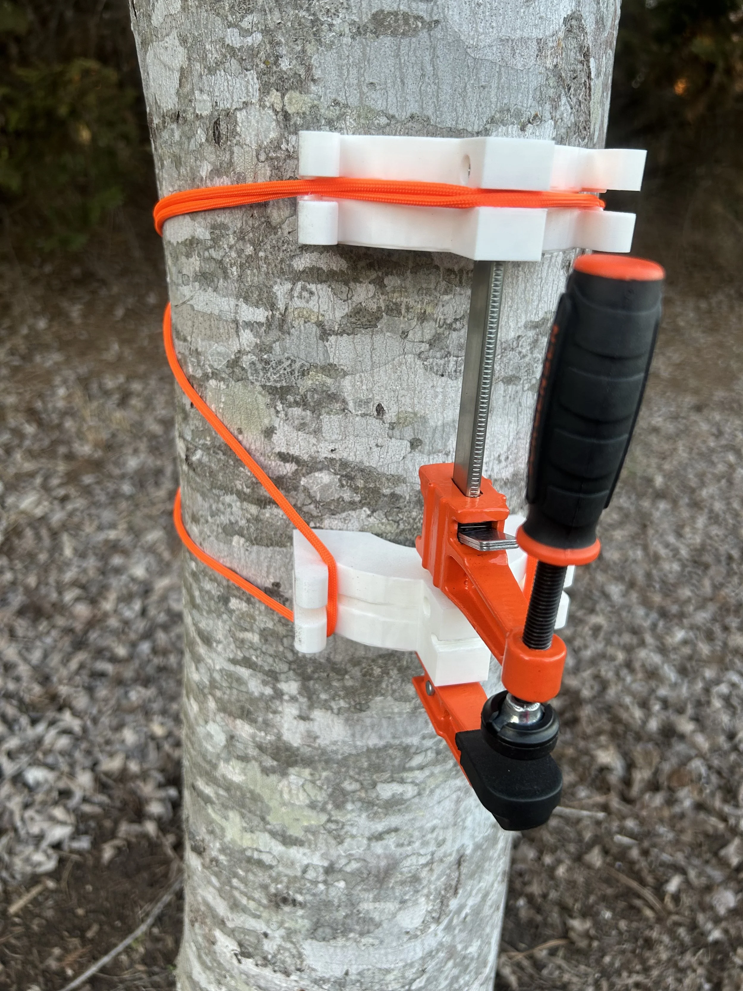 Now you can put a sturdy cutting board in the jaws and tighten it down for a great shelf! You can even use a plank of wood, or a “round” cut from a tree as your shelf. Your imagination is the limit. The clamping strength of the jaws is 300LBS. Just be safe, use common sense and enjoy your outdoor tree shelf from Bombproof Bushcraft.